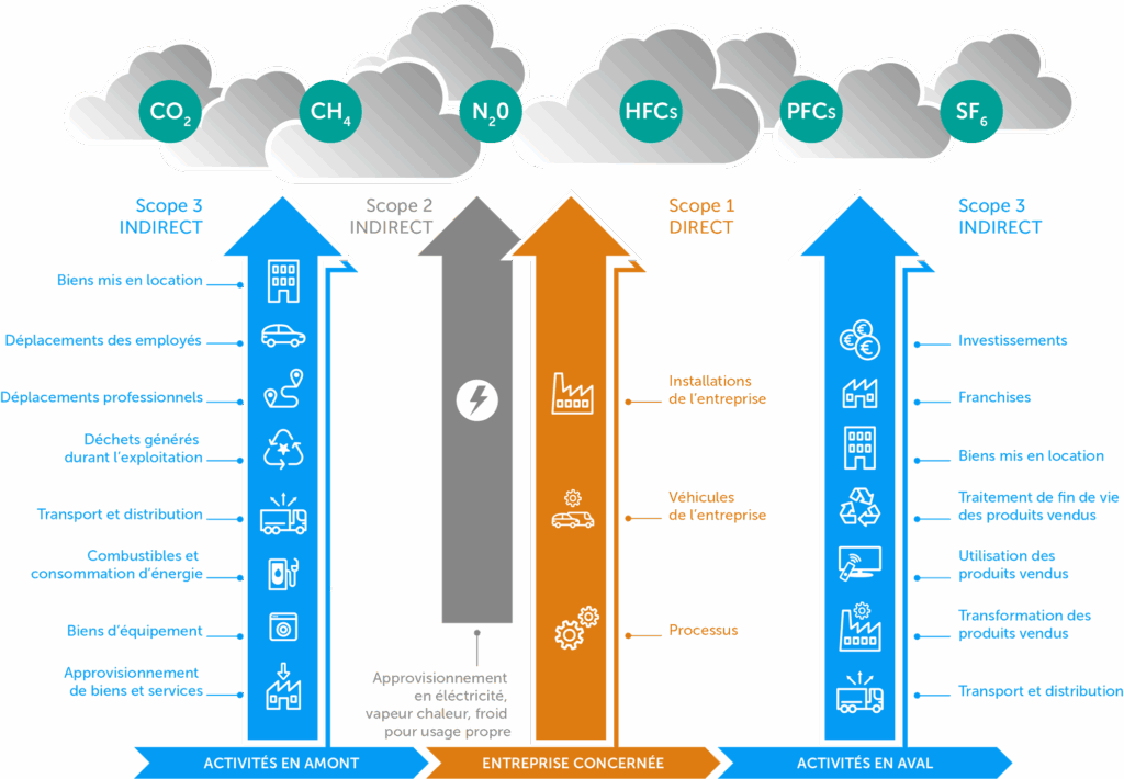 Pour faciliter le calcul, les émissions sont classées en trois scopes :