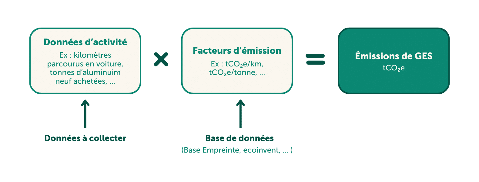 Sur base de ce cadre, il s’agit d’identifier, pour chaque source d’émissions, l’existence et la nature des données d’activité, ainsi que leur détenteur. Ces données peuvent être réelles (physiques, par exemple la masse de matière première achetée, ou financières, par exemple la dépense pour un service) ou extrapolées (à partir d’autres données, de statistiques ou d’estimations, comme l’envoi d’un questionnaire aux employés). Ensuite, les émissions de GES sont calculées en multipliant les données d’activité par un facteur d’émission.