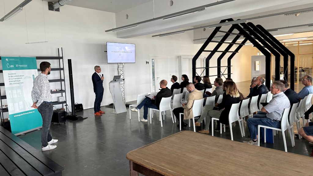 La séance a débuté par une introduction de Klima-Agence, exposant les objectifs et les engagements du Klimapakt fir Betriber, suivie d’une présentation des outils du programme par des experts de Luxinnovation, House of Sustainability et Klima-Agence.