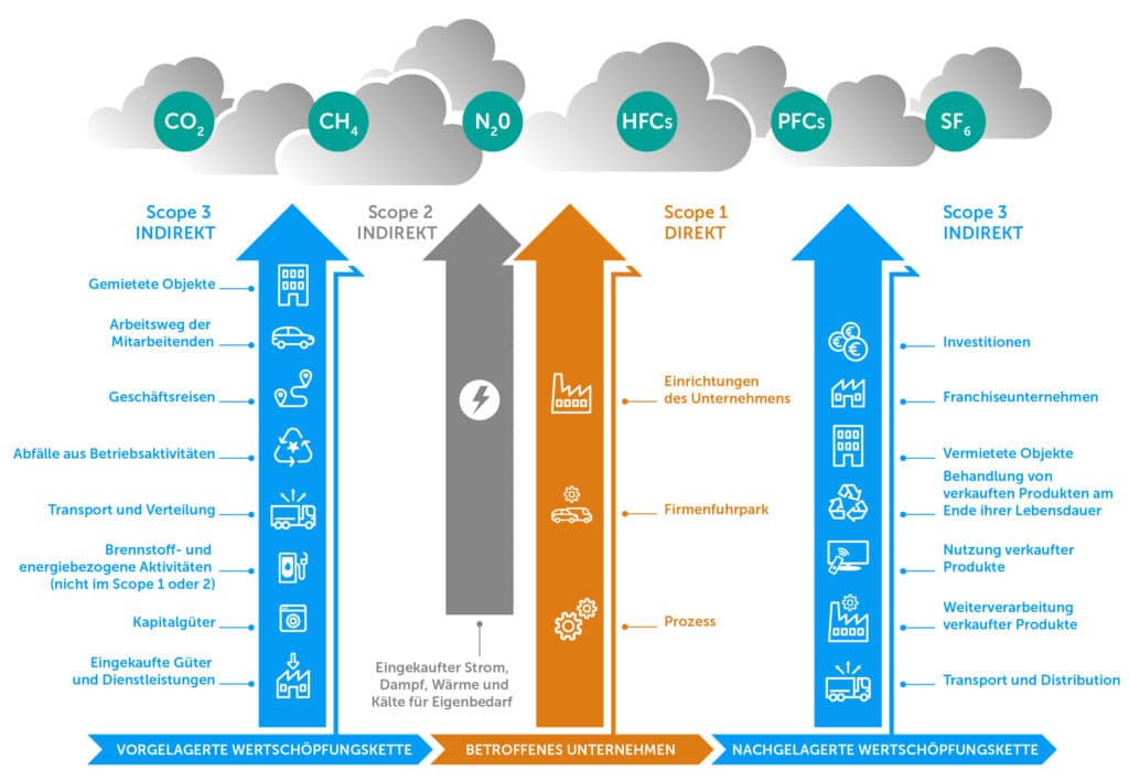 - Scope 3: Sonstige indirekte Emissionen. Scope 3 umfasst Emissionen, auf die das Unternehmen Einfluss hat, die es jedoch nicht direkt kontrolliert. Diese Emissionen entstehen entlang der Wertschöpfungskette des Unternehmens. Einige Beispiele hierfür sind: