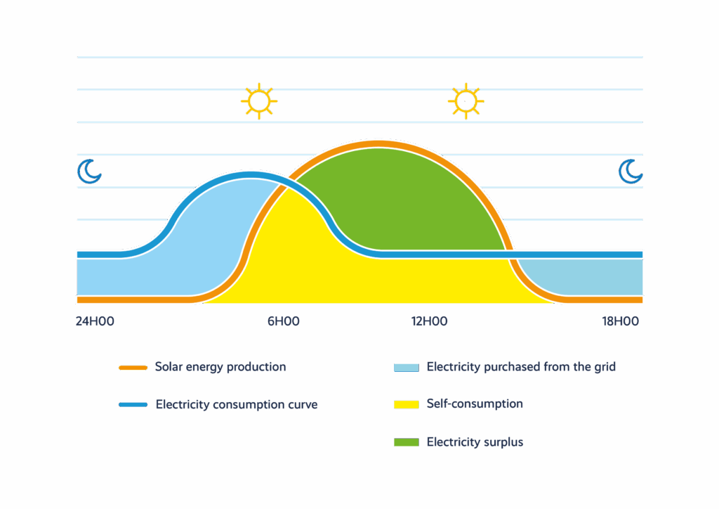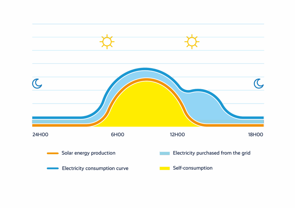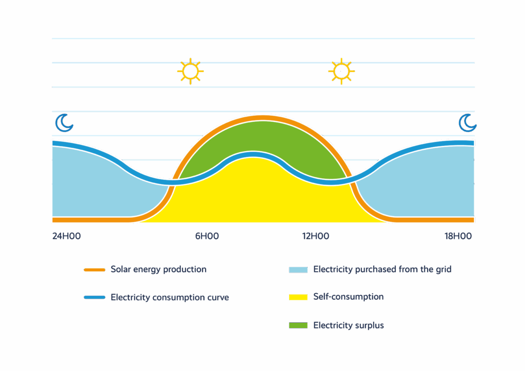 Average solar electricity production and consumption over 24 hours in a company